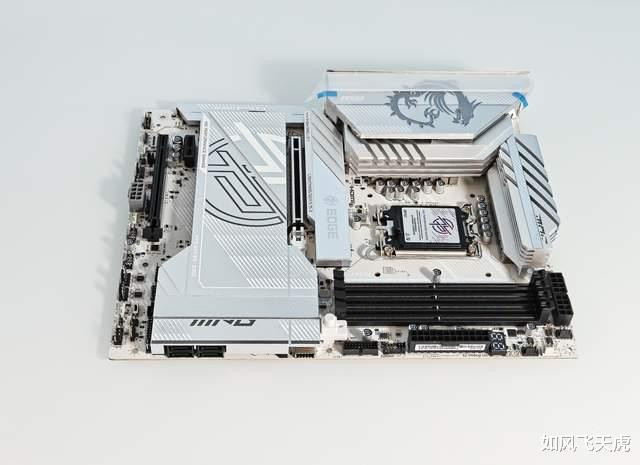 这是一款全白色主板,同时主板表面有大面积的银白色散热装甲。这款主板供电设计16+1+1+1路智能供电90A ,容量绰绰有余,可以充分发挥CPU的潜力。8层服务器级PCB板,2盎司加厚铜,第三代钛金电感,用料足。双8PIN CPU供电确保稳定,四根DDR5内存插槽,支持内存速度高达9200MT/s+。