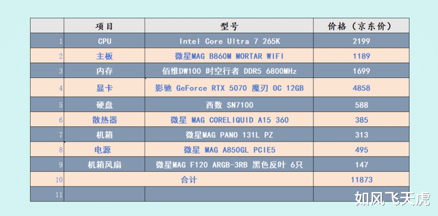 这套配置以英特尔酷睿Ultra 7 265K为核心,搭配微星 MAG B860M MORTAR WIFI迫击炮主板,微星幻影师 GeForce RTX 5070 12G SHADOW显卡,可以在2K分辨率横扫一切游戏,并且获得超强的生产力。